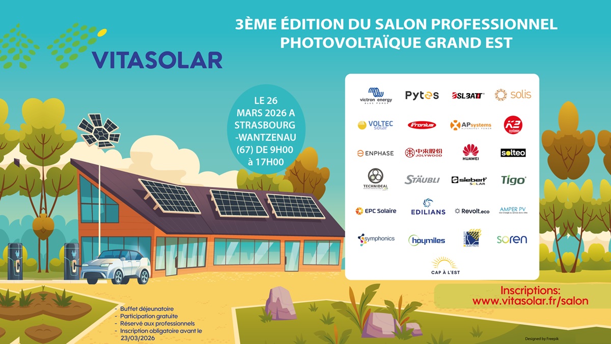 Après le succès des précédentes éditions, Vitasolar organise la 3ème édition du Salon Professionnel Photovoltaïque Grand Est. Cette journée est dédiée aux professionnels du solaire souhaitant échanger, découvrir les innovations du marché et développer leur activité. Elle offre la possibilité de rencontrer plus de 20 fabricants majeurs du photovoltaïque, d’assister à des conférences techniques sur les enjeux actuels, de développer son réseau professionnel et bien sûr de découvrir les nouvelles solutions du secteur. La participation est gratuite mais l’inscription est obligatoire au vu des places limitées.