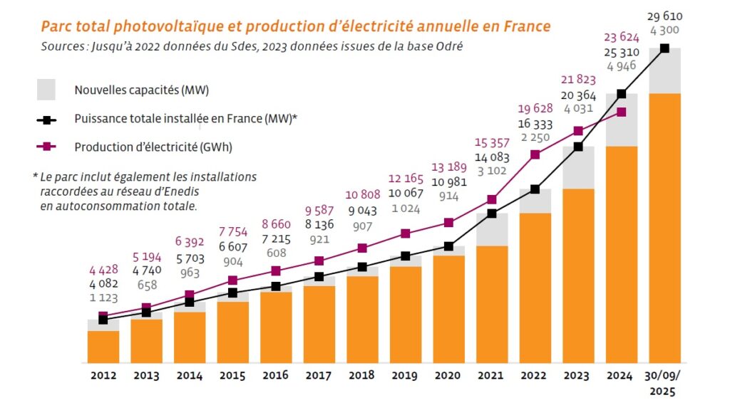 Cette montée en puissance est d’abord portée par le photovoltaïque, devenu en 2025 la première filière renouvelable en termes de capacité installée, devant l’hydroélectricité. Avec près de 30 GW raccordés à fin septembre 2025 et plus de 6,5 GW supplémentaires ajoutés sur les neuf premiers mois de l’année, le solaire confirme une dynamique exceptionnelle. La filière bénéficie notamment de l’essor de l’autoconsommation, individuelle comme collective, qui séduit de plus en plus de particuliers, d’entreprises et de collectivités.