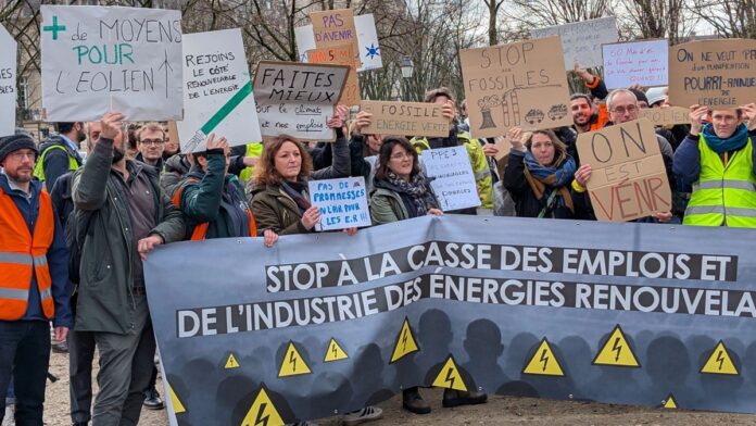 «Aujourd’hui, on se mobilise pour nos emplois, pour dire stop à l’irresponsabilité, à l’absence de cap sur la politique énergétique», a déclaré Simon Billaud-Curvale, porte-parole des organisateurs et chargé des relations publiques chez Valorem, pionnier des énergies renouvelables en France. «On a besoin de regagner de la visibilité. Nos emplois sont menacés», a-t-il poursuivi, lors du rassemblement à Paris, organisé pour «dénoncer la multiplication des suppressions d’emplois et l’absence de cap politique clair sur la transition énergétique».