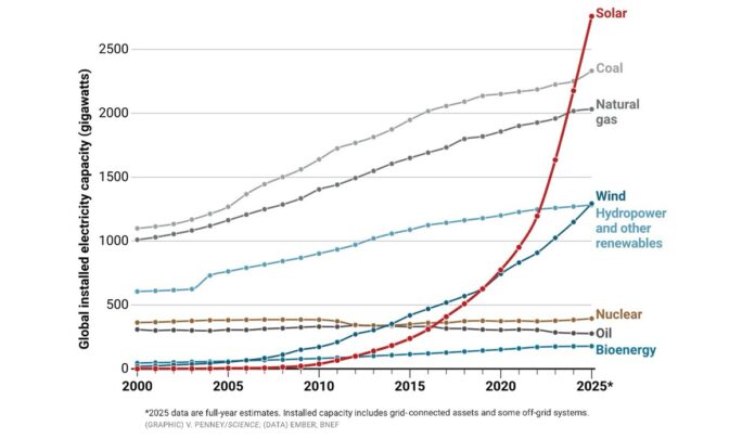 Le solaire apparaît comme le fer de lance de cette dynamique. La croissance de la production solaire en 2025 a été plus de trois fois supérieure à celle de toute autre source électrique, dépassant largement la demande additionnelle d’électricité. Cette trajectoire confirme que le solaire n’est plus une source marginale, mais bien un pilier central de l’offre électrique mondiale.
