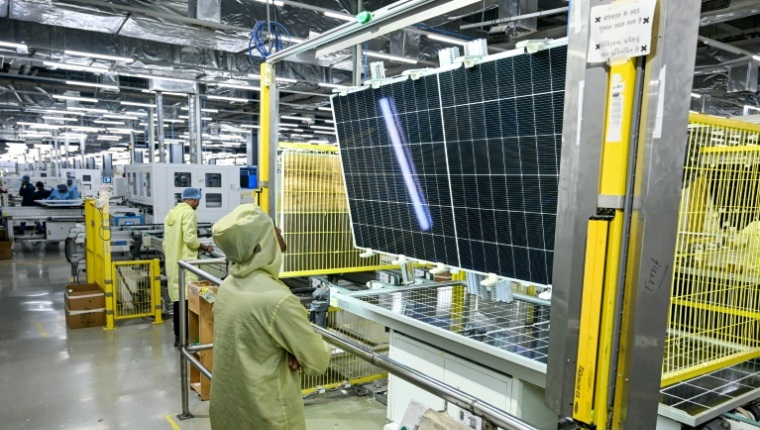Dans l’immense usine du groupe Adani à Mundra (ouest), les chaînes crachent leurs plaques photovoltaïques en continu. Jusqu’à 10.000 exemplaires par jour.