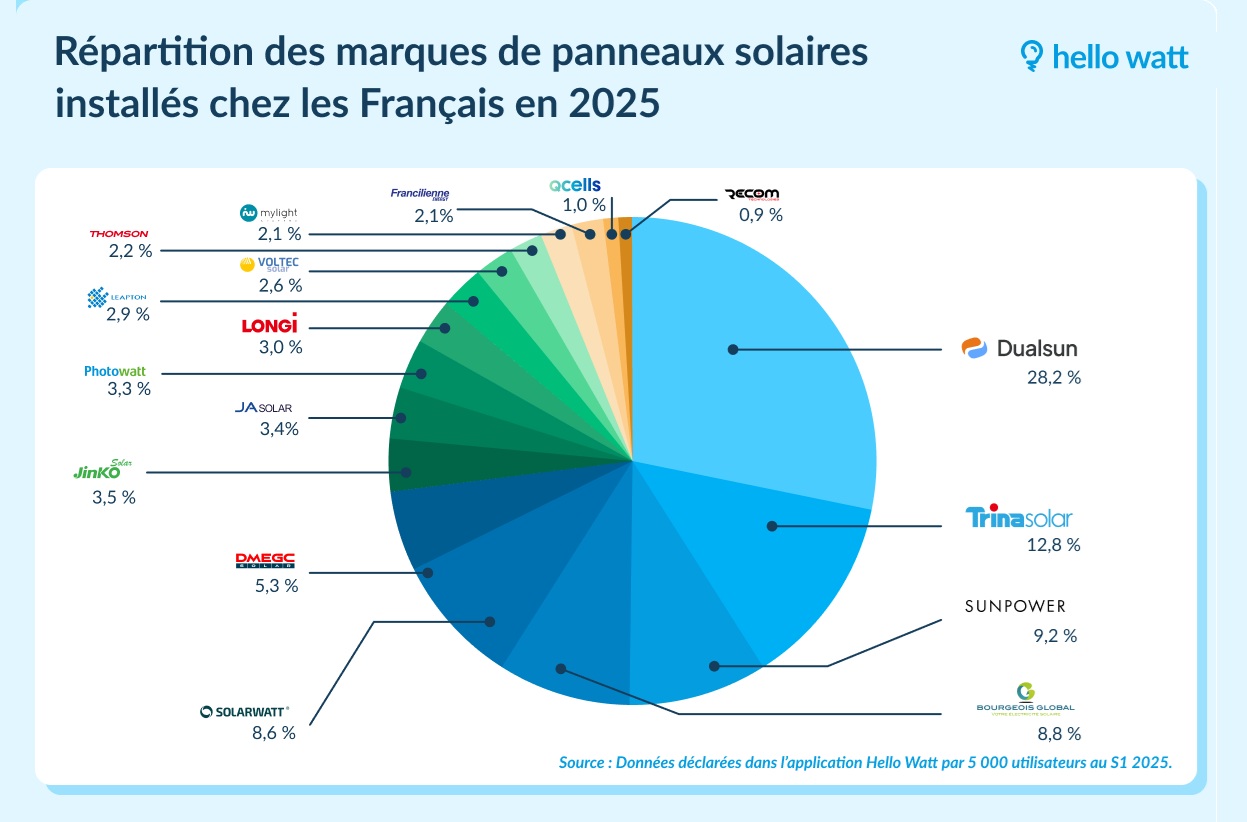 Ces trois fabricants concentrent à eux seuls près de la moitié du parc solaire installé en France. Le reste du marché demeure plus fragmenté, mais on retrouve dans le haut du classement plusieurs marques européennes et françaises : les Français DualSun, Bourgeois Global et Systovi mais aussi l’allemand Solarwatt qui a progressé de 2% entre 2024 et 2025.