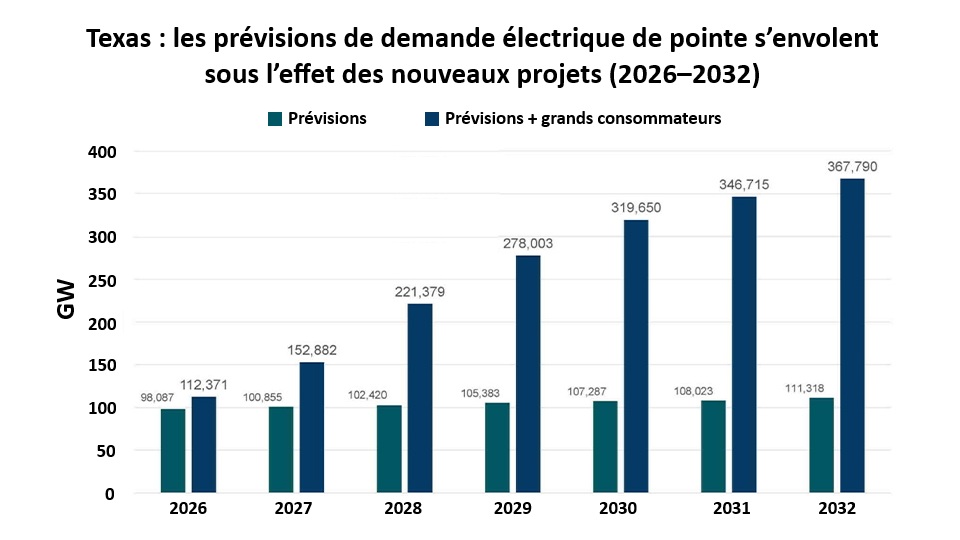 Au Texas, Le gestionnaire du réseau texan ERCOT vient de publier des projections qui témoignent d’un changement d’échelle spectaculaire : la demande électrique pourrait atteindre jusqu’à 367 GW à l’horizon 2032. Un signal fort de l’accélération de l’électrification et de la transformation industrielle à l’œuvre aux États-Unis.