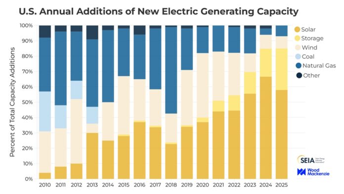 Le marché solaire des États-Unis continue de battre des records, d’après le dernier rapport U.S. Solar Market Insight publié par la Solar Energy Industries Association (SEIA) en collaboration avec Wood Mackenzie. L’industrie solaire américaine a installé 11,7 gigawatts (GWc) de capacité au troisième trimestre 2025, soit une hausse de 20 % par rapport au troisième trimestre 2024 et de 49 % par rapport au deuxième trimestre 2025. Il s’agit du troisième trimestre le plus important de son histoire en termes de déploiement. Cette étude annuelle, qui demeure la référence pour observer l’évolution de la filière photovoltaïque aux États-Unis, met en lumière des tendances robustes de croissance, des coûts en baisse et une diversification des segments solaires sur l’ensemble du territoire.