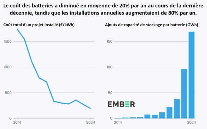 Ce changement s’appuie sur une chute spectaculaire des coûts des systèmes de stockage par batterie au cours des deux dernières années. Selon l’analyse d’Ember, le coût total d’un projet de stockage à grande échelle de quatre heures ou plus — incluant matériel, installation et raccordement — s’établit aujourd’hui autour de 110 € par kilowattheure (kWh) dans les marchés mondiaux hors Chine et États-Unis.