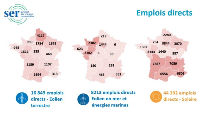 En France, les filières des énergies renouvelables ont impact majeur sur l’emploi. Elles représentent 427 732 emplois directs et indirects, répartis comme suit :