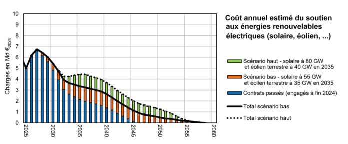 Jusqu’à l’horizon 2035, le coût annuel du soutien aux énergies renouvelables électriques restera dominé par celui des contrats conclus avant fin 2024. Grâce à la baisse des coûts de production des technologies renouvelables, le soutien unitaire pour les nouvelles installations sera plus faible que pour les installations existantes. Ainsi, en moyenne, pour les filières du solaire et de l’éolien, le coût complet de production des installations soutenues devrait être d’environ 80 €2024/MWh en 2035, contre 120 €2024/MWh aujourd’hui, ce qui se traduira par une baisse mécanique du coût du soutien public par MWh produit. CQFD !