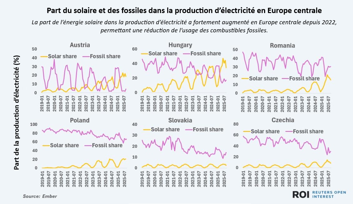 En Hongrie, la transformation est encore plus marquée : 33 % de la production électrique provient désormais de centrales photovoltaïques, contre 22 % pour les combustibles fossiles, alors que le rapport était encore de 14 % contre 35 % trois ans plus tôt.