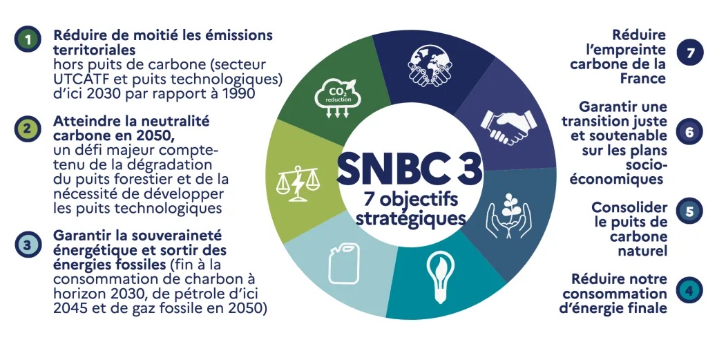 La SNBC 3 met en avant les forces structurelles françaises : un mix électrique déjà largement décarboné, des filières industrielles vertes émergentes (pompes à chaleur, batteries, transport ferroviaire, matériaux bas-carbone), des ressources naturelles (agriculture, forêts) qui contribuent activement à l’absorption du carbone. Elle a été élaborée à l’issue d’une concertation étroite avec les entreprises, la communauté scientifique, les citoyens et les collectivités locales. Leur participation à cette consultation publique a été essentielle pour enrichir et finaliser la stratégie, en ancrant sa mise en œuvre dans les territoires.